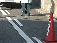 ヘルメットをかぶって、緑の服を着てなにやらメモしています。